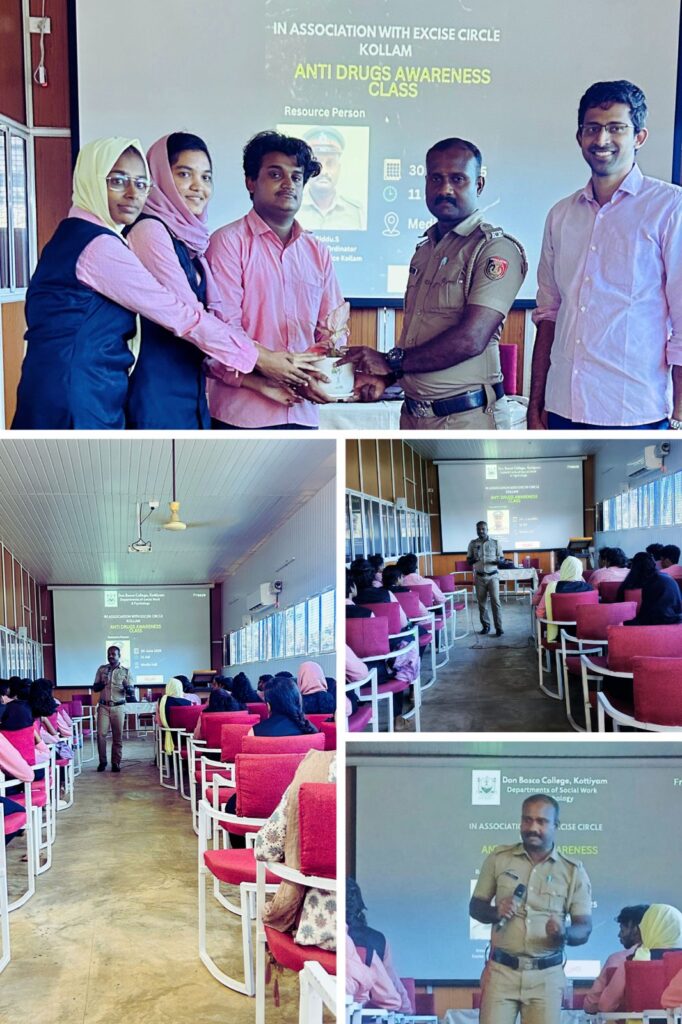 The Departments of Social Work and Psychology, Don Bosco College, Kottiyam, in collaboration with the Excise Circle Office, Kollam, successfully conducted an Anti-Drugs Awareness Class on 30th June 2025 at 11:00 AM in the Media Hall. The session was led by Sri. Siddu S., Vimukthi Co-ordinator, who provided deep insights into the growing menace of […]