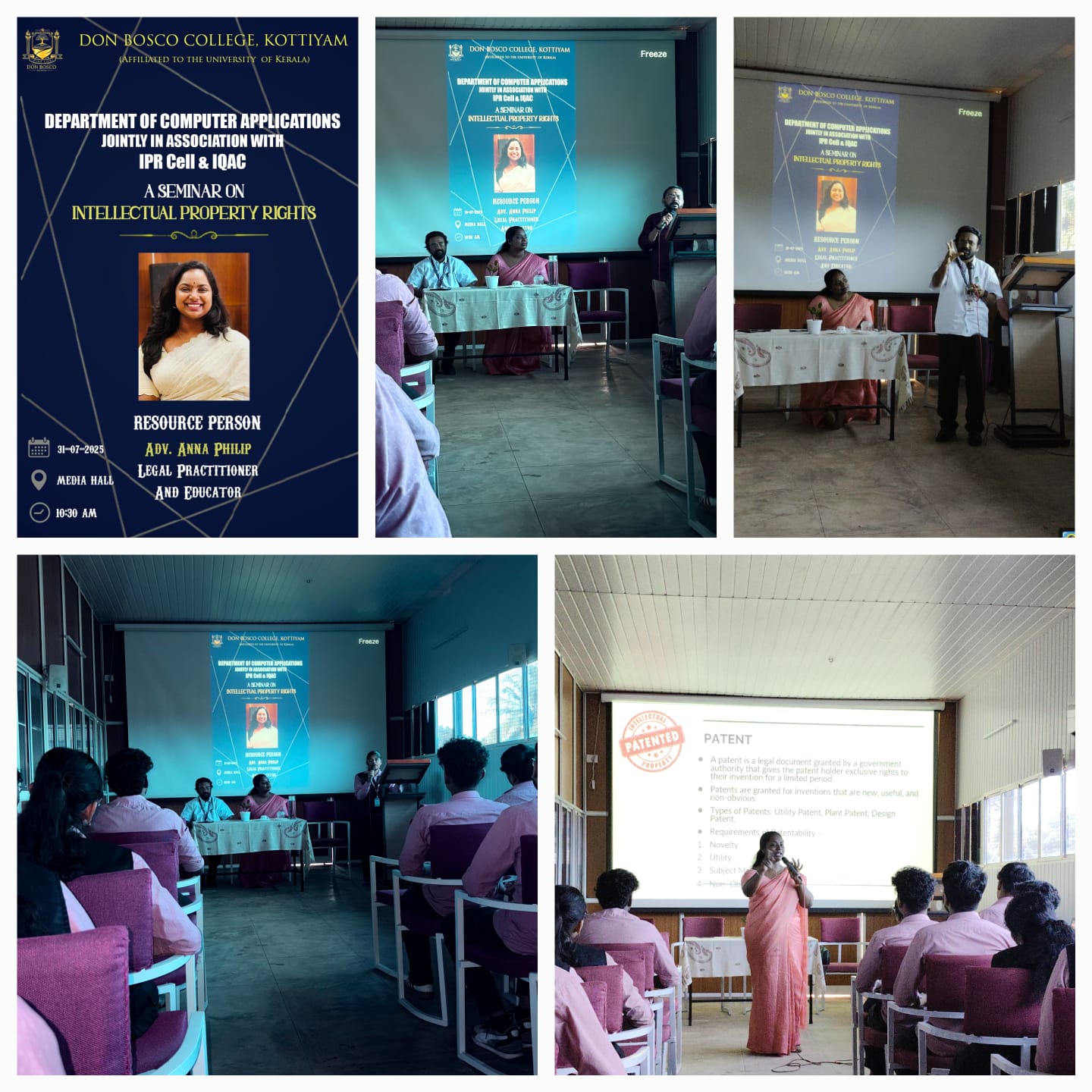 The Department of Computer Applications, in association with the IPR Cell and IQAC, organized a seminar on Intellectual Property Rights (IPR) for BCA students. The session was led by Adv. Anna Philip, a legal practitioner and educator, who provided insightful guidance on the importance of IPR in safeguarding creative and intellectual works. The seminar offered students a deeper understanding of copyrights, patents, and legal aspects relevant to the digital age.